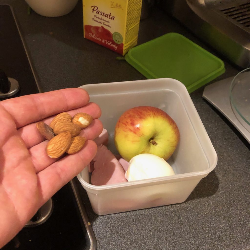 For food, I want to look at the concept of snacks. Balancing a Zone blocks of 9g carb, 7g protein and 1.5-3g of fat. In my container I’ve put 1 boiled egg (1 block of protein), 3 almonds, 1 block of fat and what will be half an apple ( 1 block of carbs.)