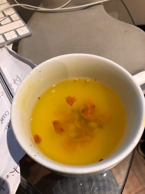 Cut an inch of turmeric, chop it up ( or grate it), add some lemon juice put it in a cup of hot water with a pinch of black pepper (the Piperine in black pepper helps with the absorption of Curcumin in turmeric) and voila, you have drink that is truly awful. Another recipe suggested adding some ginger. That it works a treat, it makes it taste even nastier.
