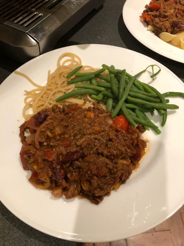 Todays food is the “disguised Spag bol”. In this concoction you can hide a multitude of sins. Today I sneaked in a lump of turmeric, some celery and carrots. I also threw in a big pile of herbs from our balcony, THAT I GREW!