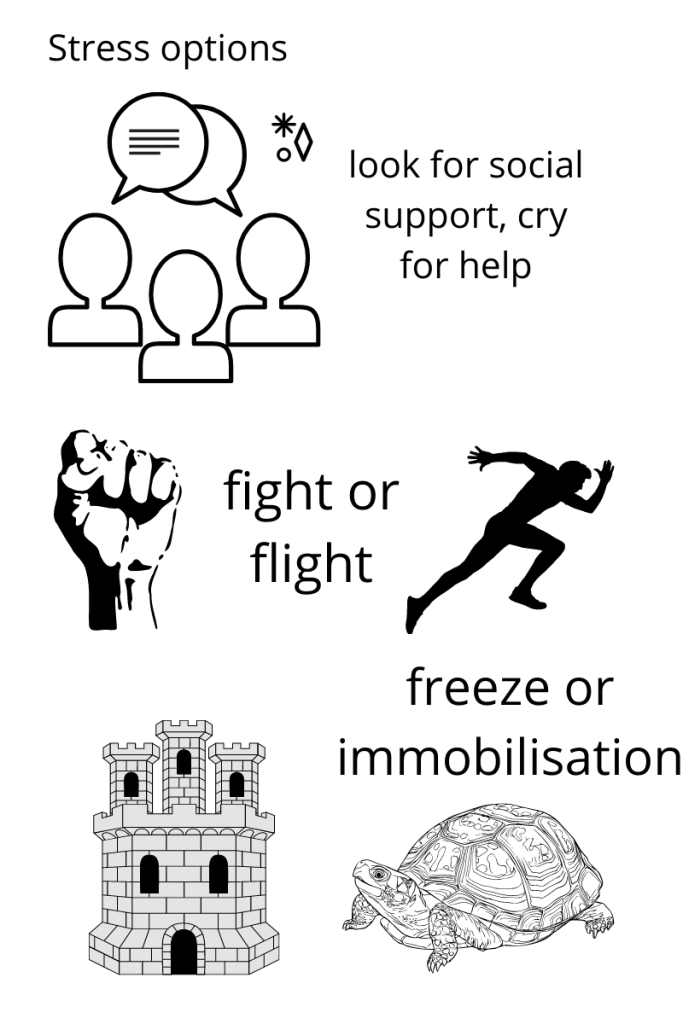 In basic polyvagal theory ( note, it’s a theory, not a gospel, or the law or indisputable) Porges identifies 3 groups of reactions to stress. Let make this easy. Let’s say you see a mugger coming to mug you.