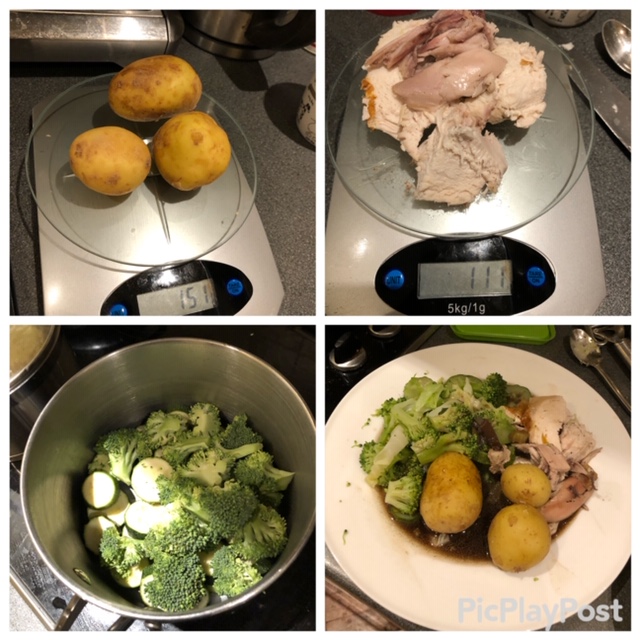Here we have 112g of roast chicken, (4 blocks) 150g of boiled potato (3 blocks) . I rubbed 2 blocks of butter onto the chicken ( kate loves her crispy skin) and put about 2 blocks of butter onto the vegetables. I boiled up a “mess” of courgettes, broccoli and cabbage, served with an ” as much as you can eat” mentality. Any diet that restricts non starchy carb should be avoided. As many veggies as you can get down I say!!