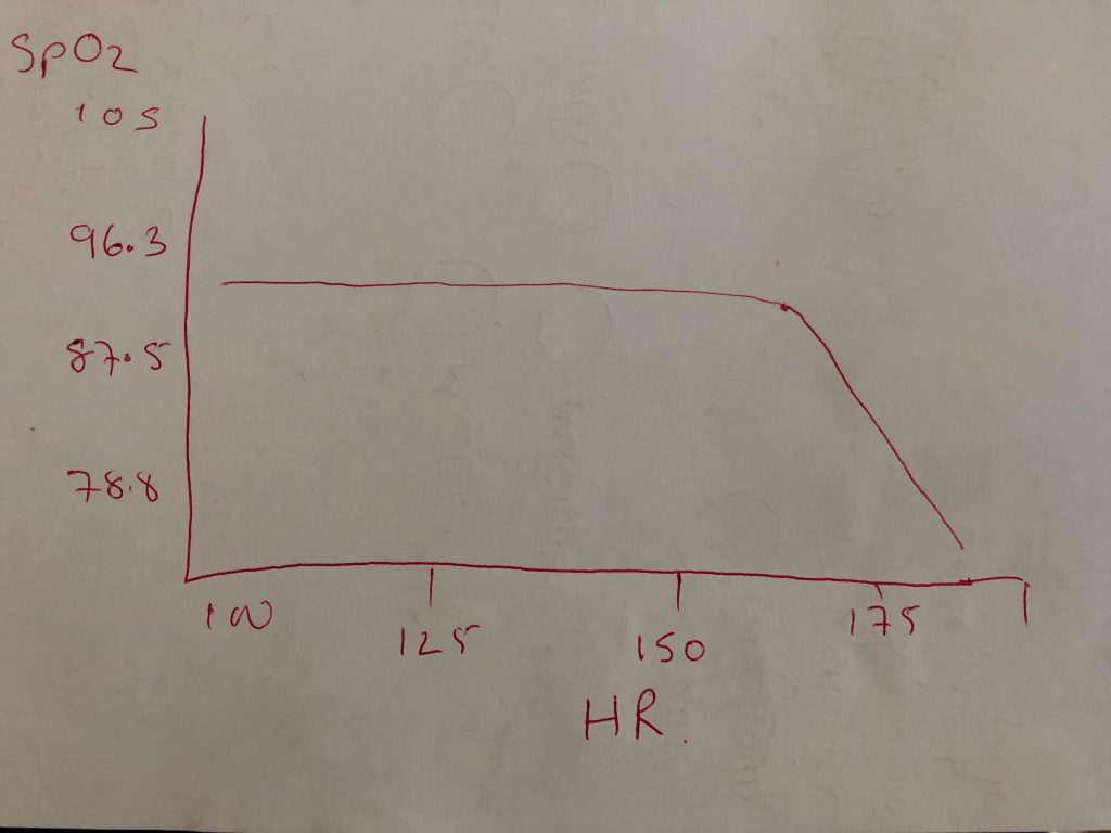 This observation was supported by David Lin et al who wrote “Oxygen saturations and heart rate during exercise performance” There is a fascinating write up here This basically showed that at a certain level of work, you can see a drop in O2 saturations