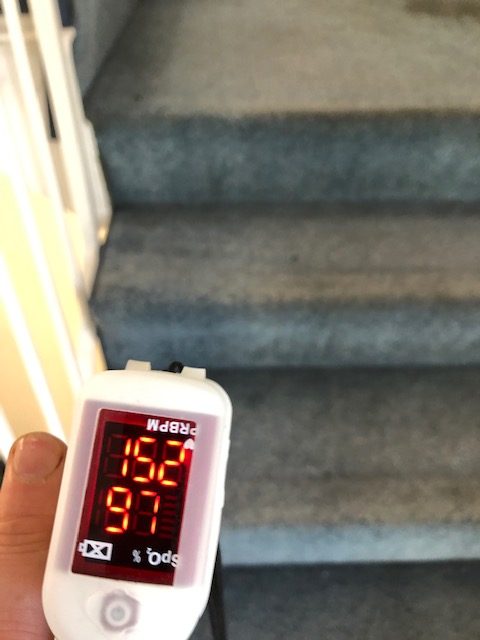 After a quick recovery our workouts always end with a disgusting stair climb to our flat ( to get home and haul the kettlebells back up) At the top it always feels as if you are going to die. As I reached the top I managed to get my pulse ox back on and whilst my heart rate was 160, my O2 saturations were 97. It took me a while to get my phone out so I only got a photo after my heart rate had dropped to 152
